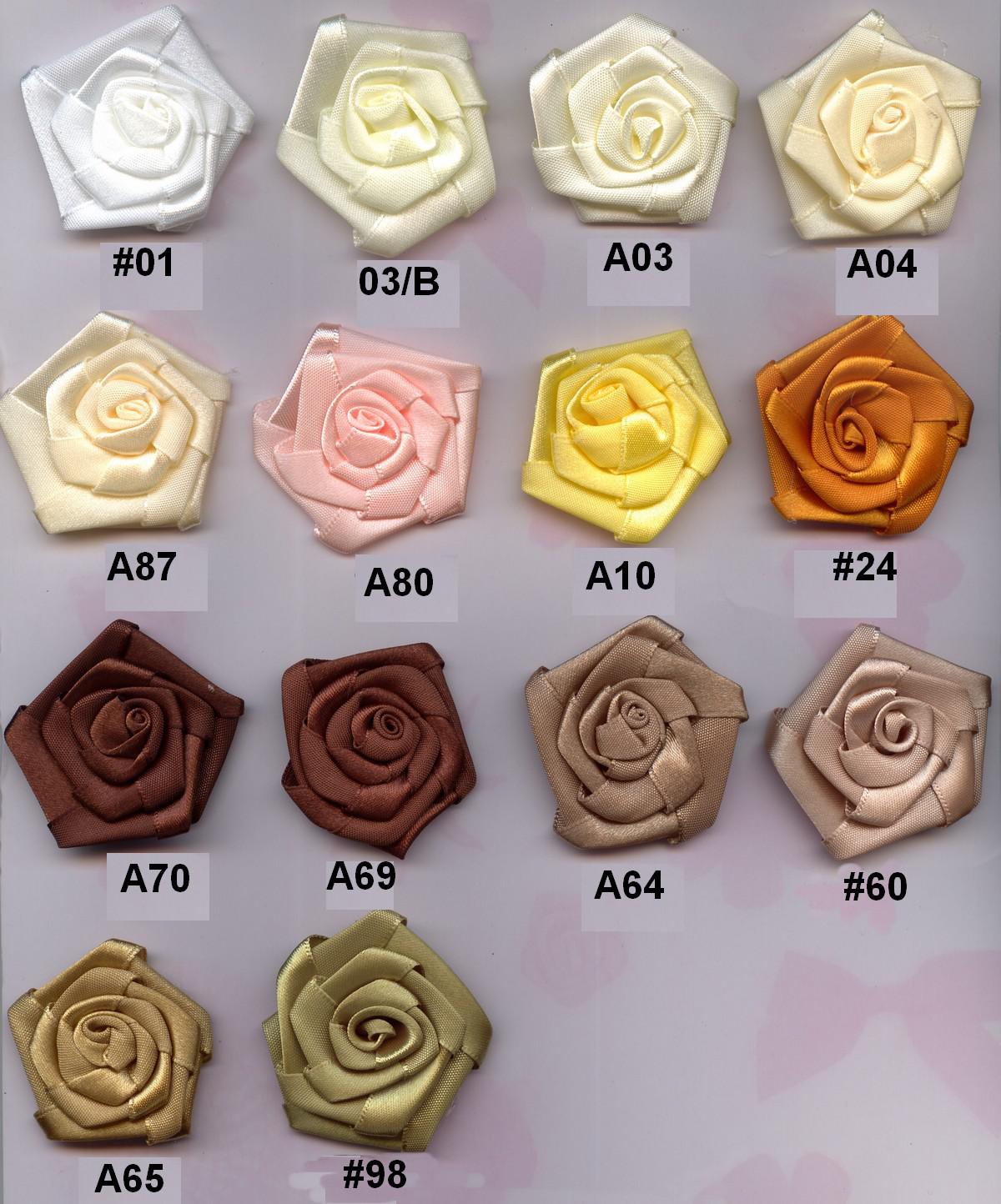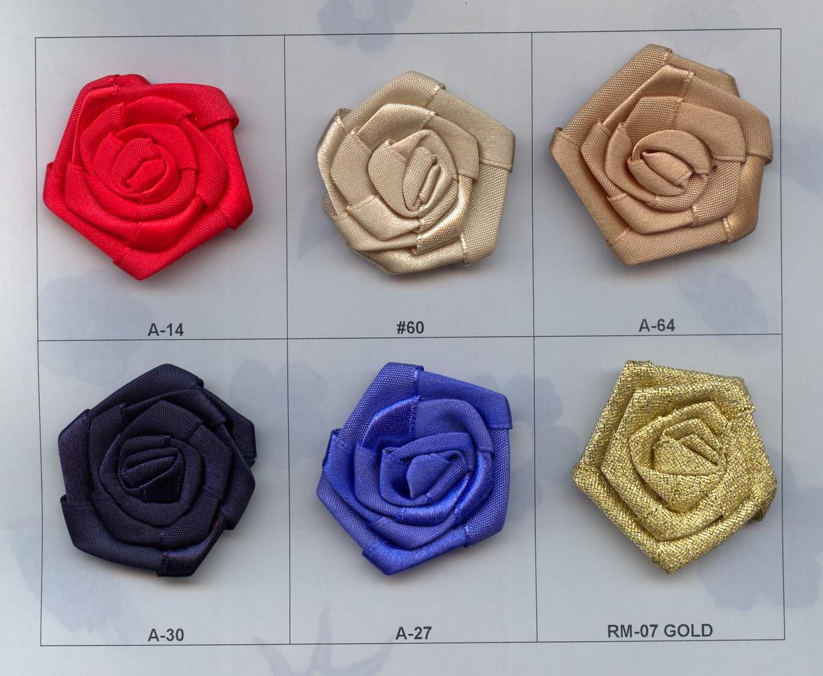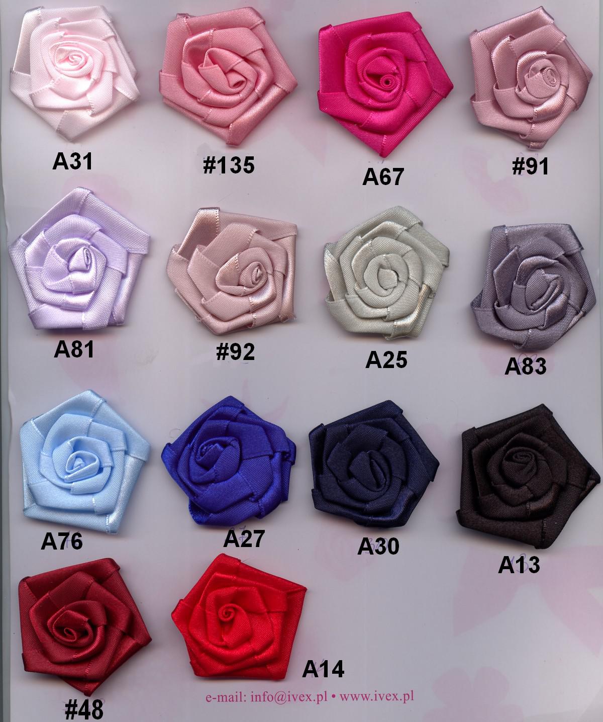 Różyczki ze wstążki atłasowej o średnicy ok. 5cm, zgrzewane.