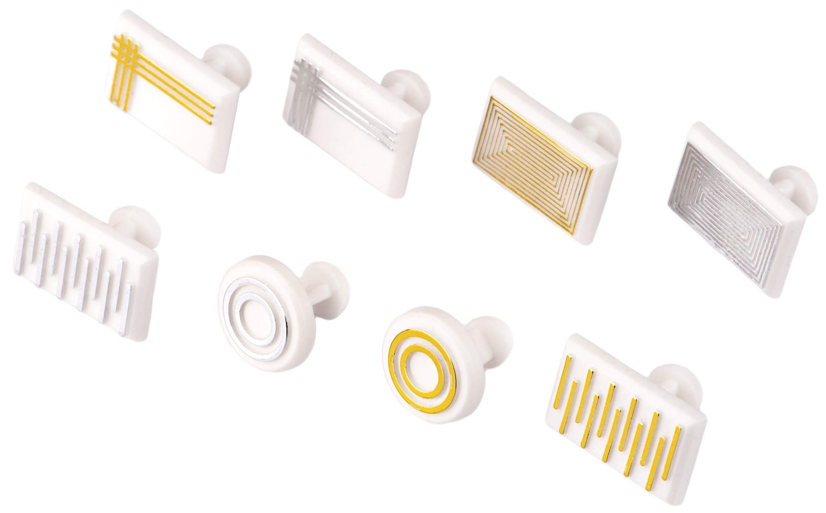 Spinki do mankietów, do koszul męskich, chłopięcych, wizytowych, sportowych. Występują w wersji gładkiej oraz ze wzorem, który może być pokryty kolorową folią. Zastosowanie spinek oraz plomby (przywieszki) z etykietą wykonanych w tym samym stylu znacznie podnosi estetykę zapakowanej koszuli i staje się znakiem rozpoznawczym firmy.