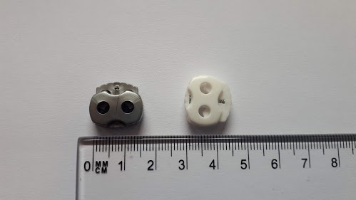Dwudziurkowy stoper do sznurka i gumosznurka wykonany z tworzywa sztucznego.