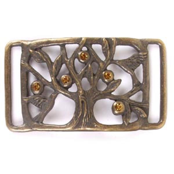 Duża prostokątna ozdoba z ornamentem w kształcie drzewa, zdobiona symilkami, mocowana paskiem.
