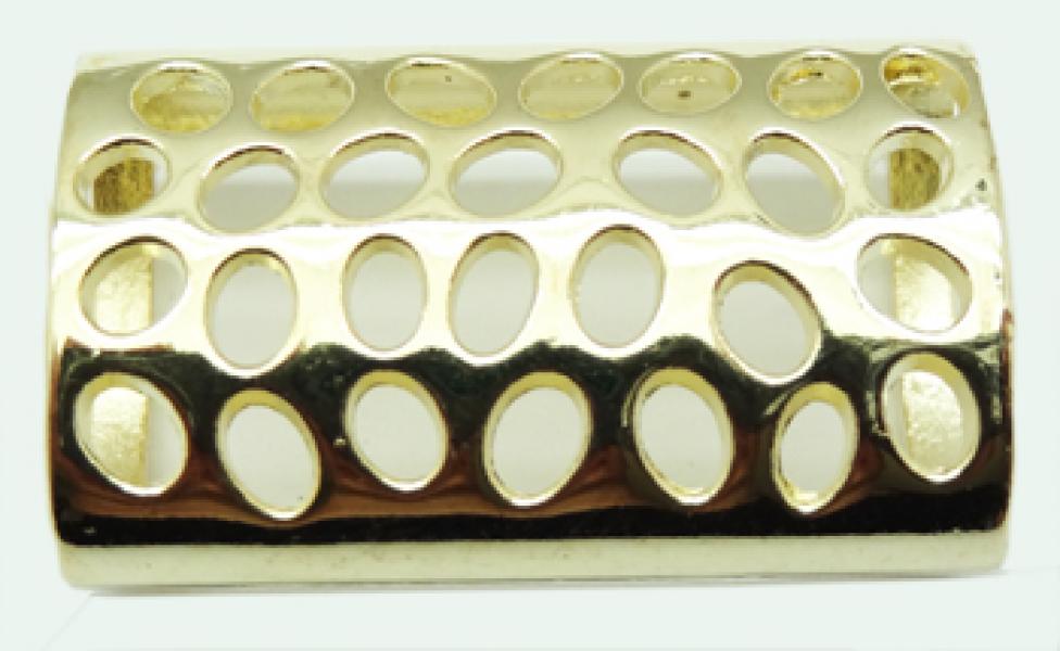 Ozdoba w kształcie spłaszczonej rurki, powierzchnia z dwóch stron ozdobiona dziurkami.