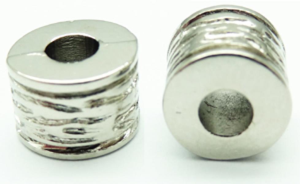 Ozdoba w kształcie walca z otworem na sznurek bądź pasek. Brzegi zewnątrz ozdobione grubymi rowkami.