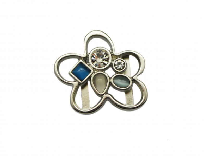 Ozdoba wykonana ze stopu ZnAl, ozdabiana kamienniami i symilkami. W formie przekładki.